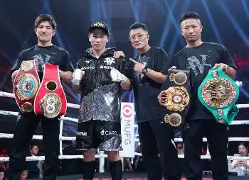 <ダブル世界戦 井上・ドヘニー>防衛に成功した井上。左からいとこ・浩樹、井上、弟・拓真、父・真吾トレーナー(撮影・島崎忠彦)