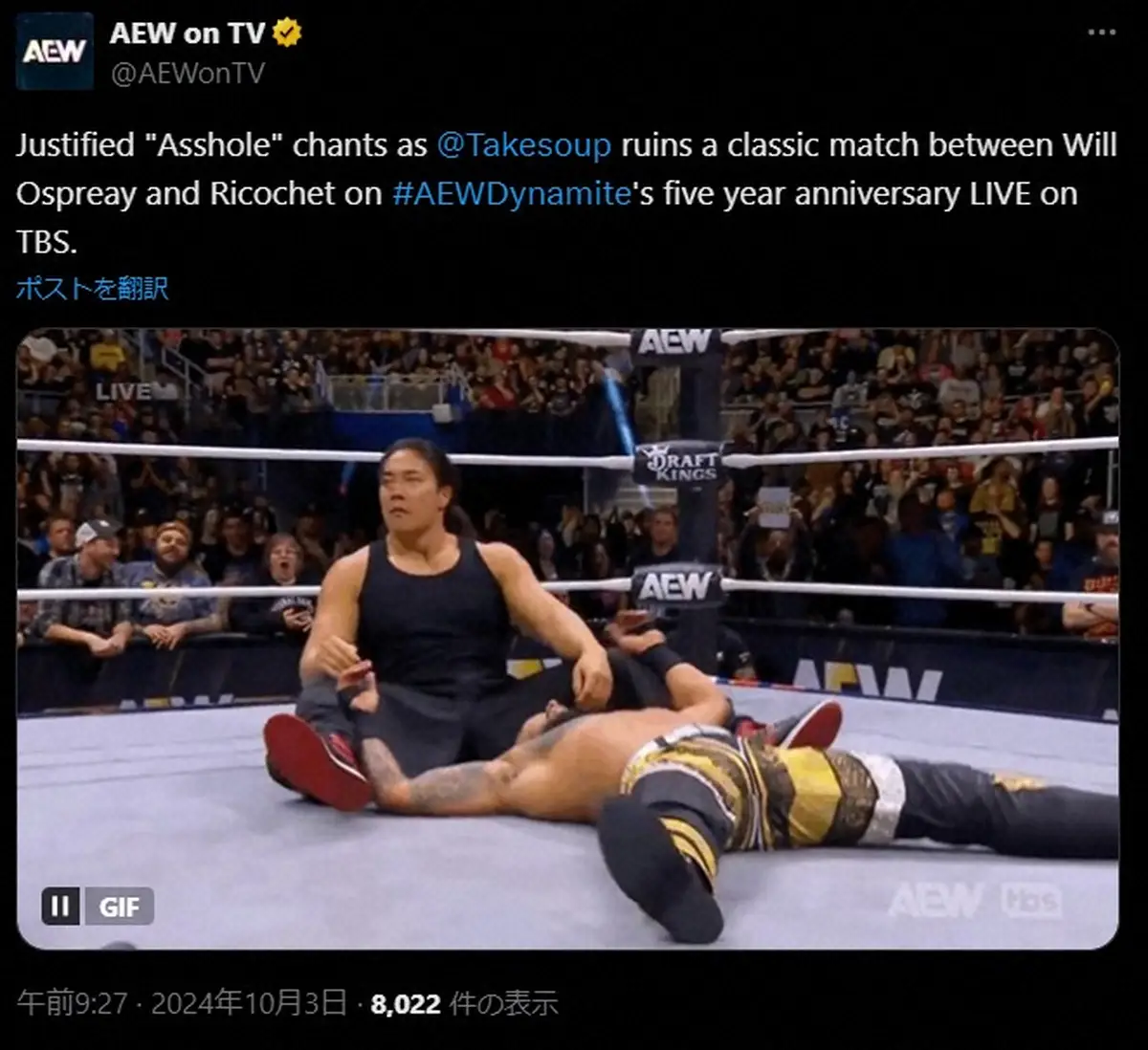 ファン大熱狂のオスプレイVSリコシェ。AEWの公式X(@AEW)から 【AEW】ファン大熱狂のオスプレイVSリコシェ!ダブルフォールで再試合も…… ギャラリーで見る この記事のフォト 2024年10月03日の画像一覧 もっと見る 2024年10月03日の画像をもっと見る