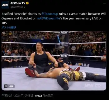 米国プロレス団体「AEW」が現地時間2日(日本時間3日)に「AEW DYNAMITE 5周年記念大会」を開催。AEWインターナショナル王者ウィル・オスプレイが、今年9月にAEWと契約したリコシェの挑戦を受けた。ファン大熱狂の試合は、まさかのダブルフォールから再試合が行われたものの、竹下幸之介の乱入でノーコンテストに終わった。
