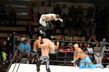先制したのは本家#STORONGHEARTS連係プレーから吉岡のラ・ケブラーダで会場を沸かさせた。今度は「ラスカルズ」がスピーディーな連係技を見せて徐々にペースを握り返した。
