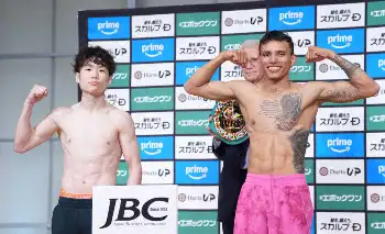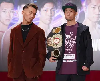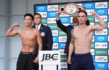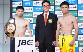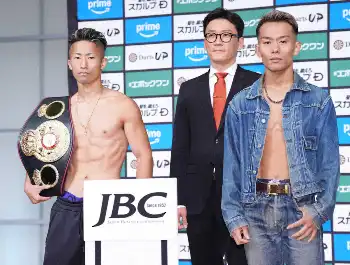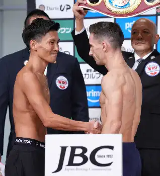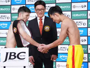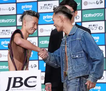 <8大タイトル戦計量>計量パスし握手を交わす阿久井(左)とタナンチャイ(撮影・島崎忠彦) Photo by スポニチ V2戦のユーリ阿久井政悟はリミットで一発パス 挑戦者は100グラムアンダー ギャラリーで見る この記事のフォト 2024年10月12日の画像一覧 もっと見る 2024年10月12日の画像をもっと見る