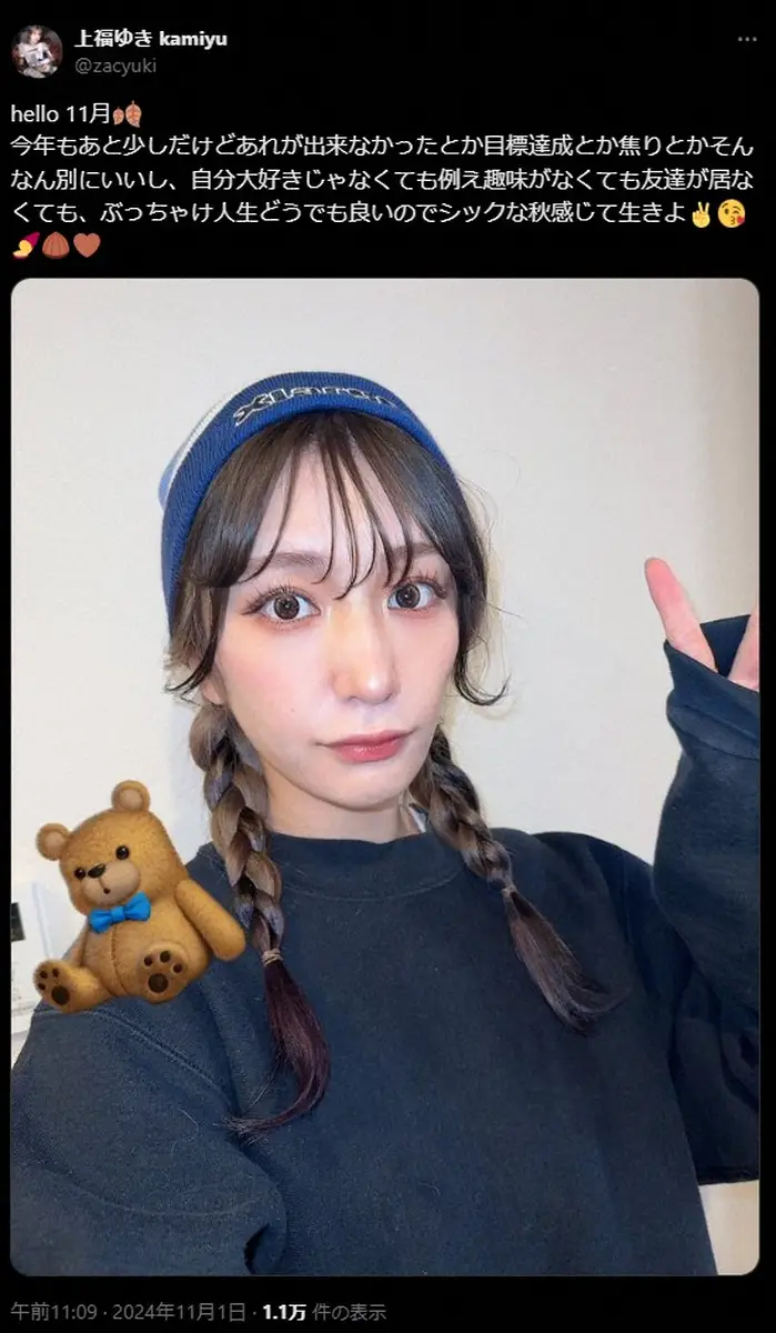 そして自身のXでも同じ写真とともに「hello 11月」と題してつづり始めた。「今年もあと少しだけどあれが出来なかったとか目標達成とか焦りとかそんなん別にいいし、自分大好きじゃなくても例え趣味がなくても友達が居なくても、ぶっちゃけ人生どうでも良いのでシックな秋感じて生きよ」とファンにメッセージを送った。