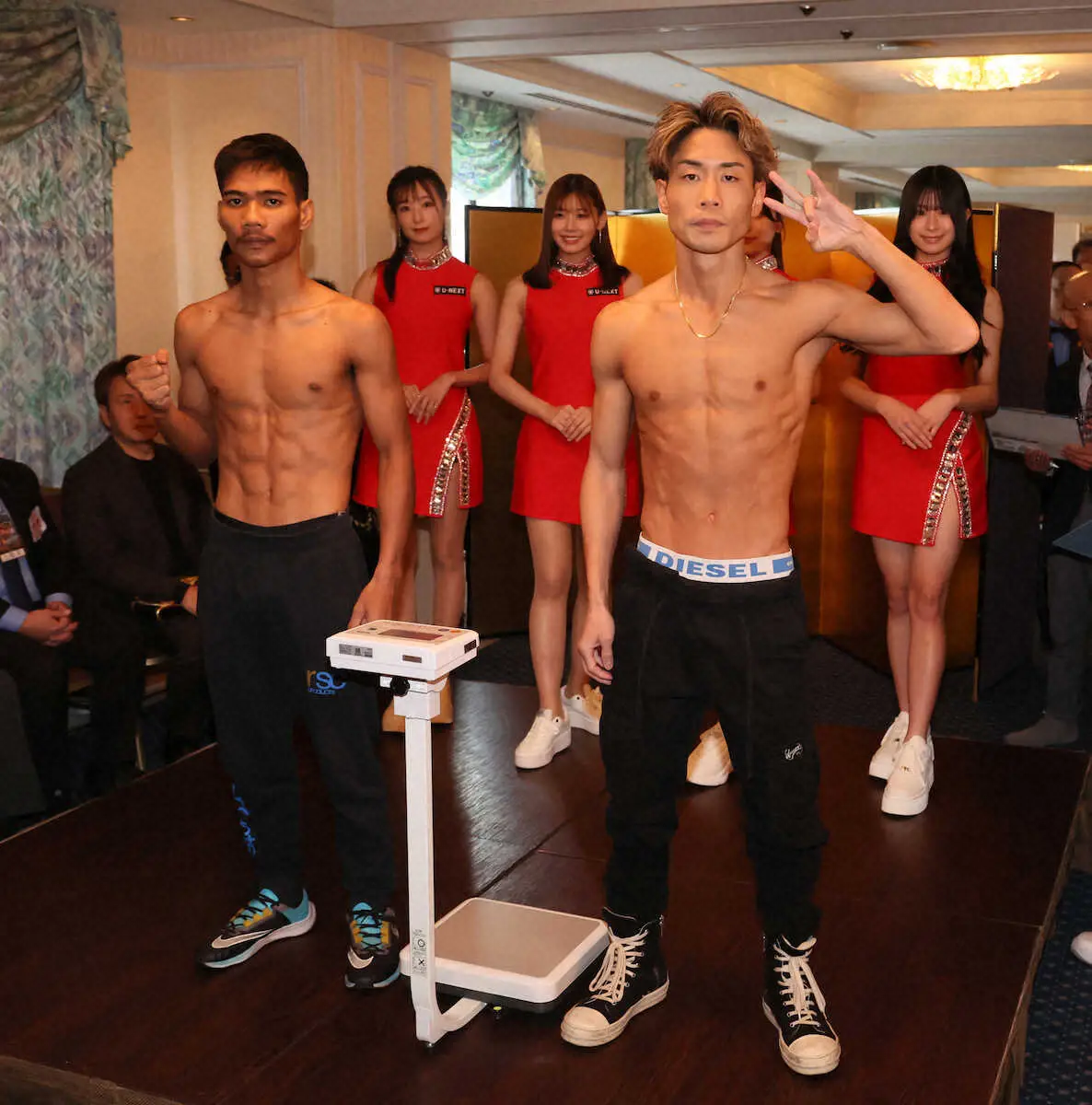 プロボクシング興行「U―NEXT BOXING」(15日、大阪・住吉スポーツセンター)の前日計量が14日、大阪市内のホテルで行われた。