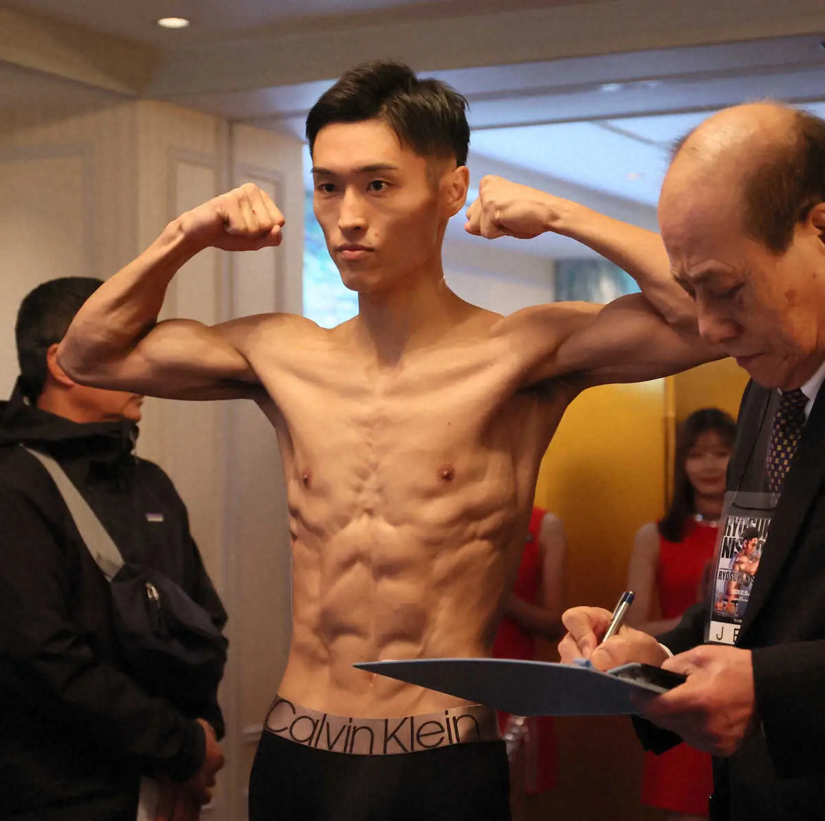 世界戦の前日計量が14日、大阪市内で行われ、王者の西田はリミット53・5キロを200グラム下回る53・3キロ、挑戦者アヌチャイは500グラム下回る53・0キロで一発クリアした。