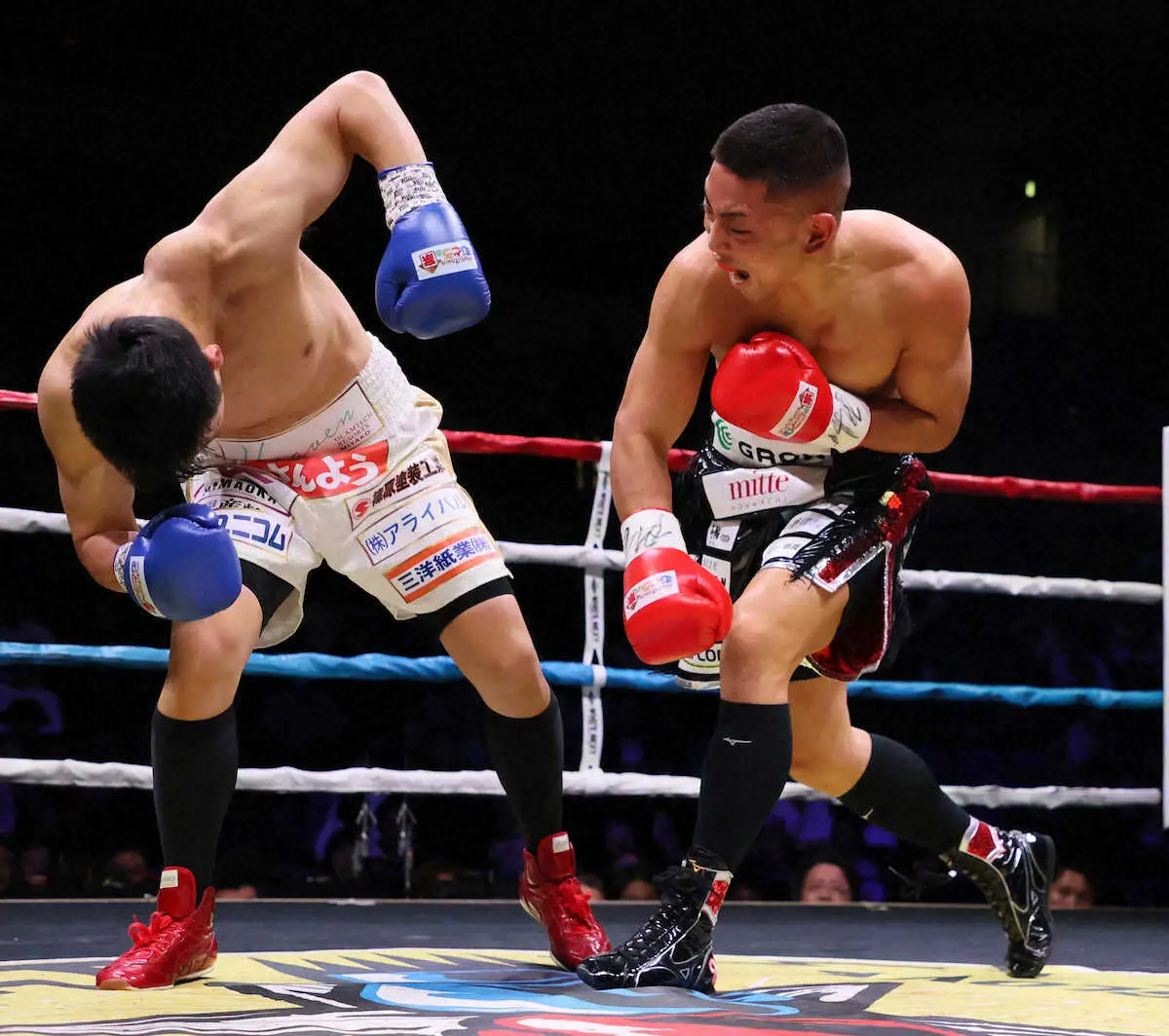 <WBOAPミドル級タイトルマッチ>1R、竹迫(左)に対し、右を打ち下ろした国本