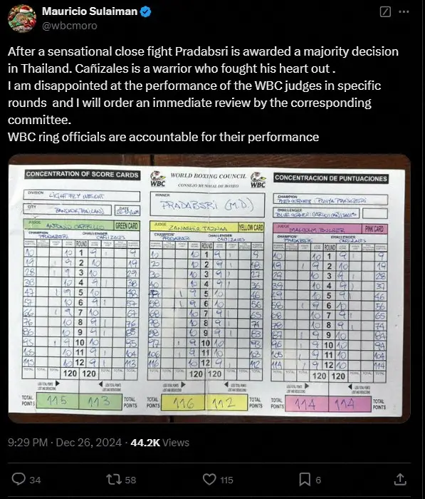 WBCのマウリシオ・スライマン会長は自身のX(旧ツイッター)に採点表の写真を掲載。「センセーショナルな接戦の末、タイでプラダブシー(パンヤ)に2-0で判定が下されました。カニサレスは全力を尽くして戦った戦士です。いくつかのラウンドでのWBCのジャッジの判断にガッカリしていて、私は委員会に即時の調査を命じます。WBCのリングオフィシャルは判断の責任を負います」とコメントした。専門メディアのボクシングシーンは「2024年の最も判定を盗まれた賞の候補。正義は果たされず、マウリシオ・スライマンが行動を起こすことになるだろう」と批判した。