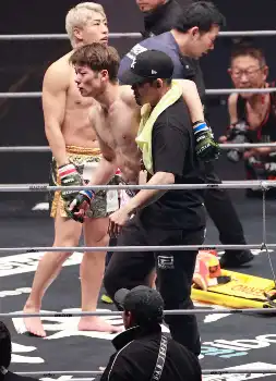 衝撃的な結末が待っていた。MMAデビュー戦となった冨澤はスタンディングの展開で、三浦がタックルを仕掛けてもしっかり防御。再びタックルを仕掛けてきた相手にヒザ蹴りを合わせてKO勝利を飾ると雄たけびをあげた。