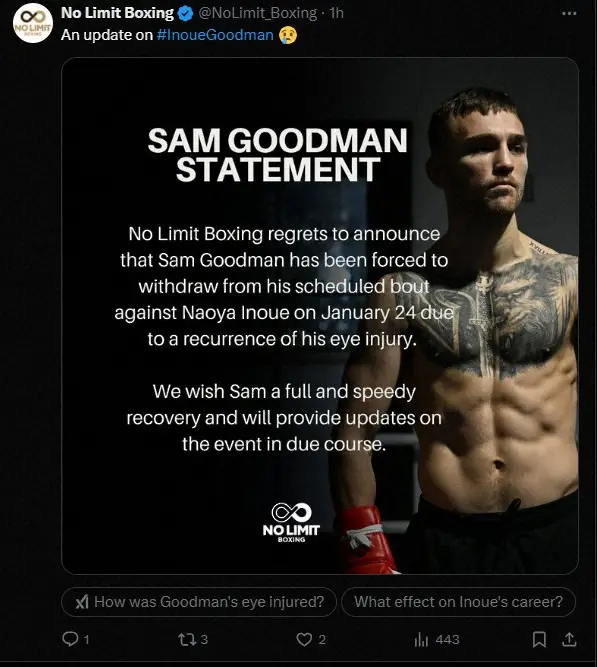プロボクシング世界スーパーバンタム級4団体統一王者・井上尚弥(31=大橋)に挑戦予定だったIBF、WBO1位のサム・グッドマン(26=オーストラリア)が、左目上のケガの再発により挑戦を断念した。グッドマンをプロモートする「ノーリミット・ボクシング」が11日、今月24日に東京・有明アリーナでの井上戦を棄権すると発表した。