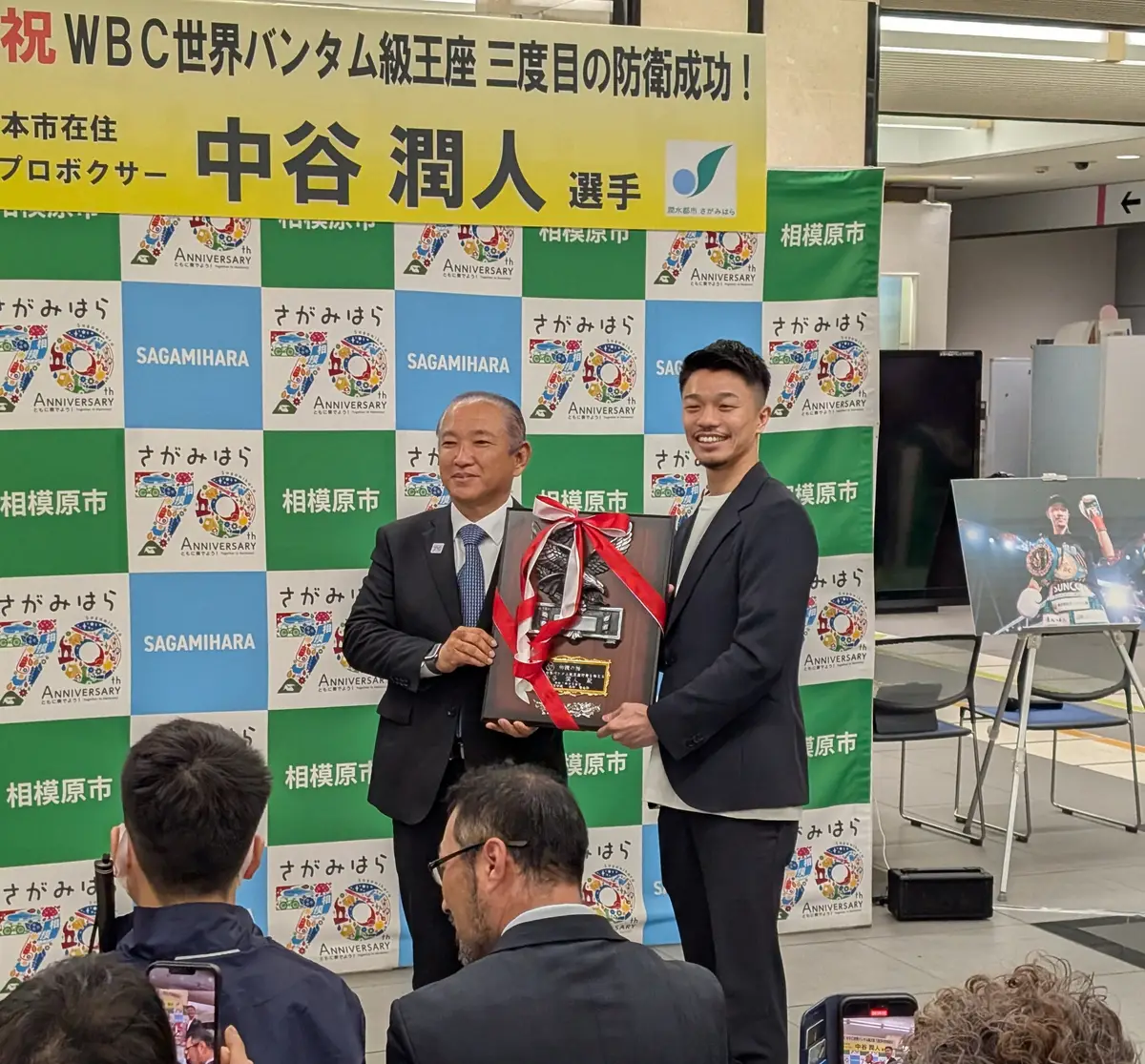 プロボクシング世界3階級制覇のWBCバンタム級王者・中谷潤人(27=M.T)が29日、所属ジムがあり自身が「ホームタウンアスリート」を務める神奈川県相模原市の市役所を訪れ、本村賢太郎市長らに3度目の王座防衛を報告した。