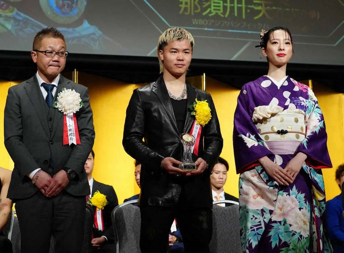 努力・敢闘賞のWBOアジア・パシフィック・バンタム級王者の那須川は昨年の新鋭賞に続く受賞に「一個ずつランクアップして、来年はもっといい賞を獲りたい。MVP?それはもちろん」と笑顔で語った。