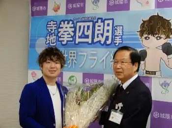 世界戦に勝った後の恒例行事。城陽市役所を訪問後、取材に応じた拳四朗は「無事に勝って、地元にベルトを持って帰れてうれしい」と安堵の笑みを浮かべた。