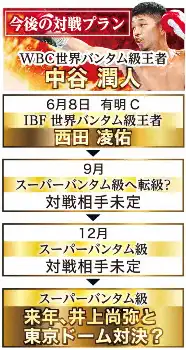 先月末の年間表彰式で世界スーパーバンタム級4団体統一王者・井上尚弥(大橋)と来春の東京ドームでの対戦を約束した。井上戦に向け、今後は転級も見据える。順調なら西田戦がバンタム級ラストマッチとなる可能性が濃厚だ。「同じサウスポーでスタイリッシュなボクシングをする相手」と無敗対決に警戒しつつ、世界戦5連続KOへ「もちろんそういうアクションを増やしていきたい」と意気込んだ。