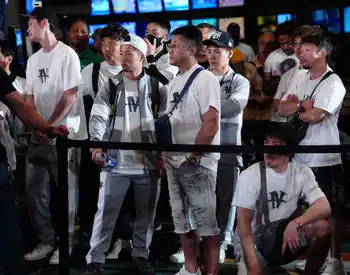 <井上尚弥・カルデナスアライバルイベント>井上尚哉のインタビューを見つめる弟・拓真(中央左)、父・真吾トレーナー(中央右)=撮影・木村 揚輔