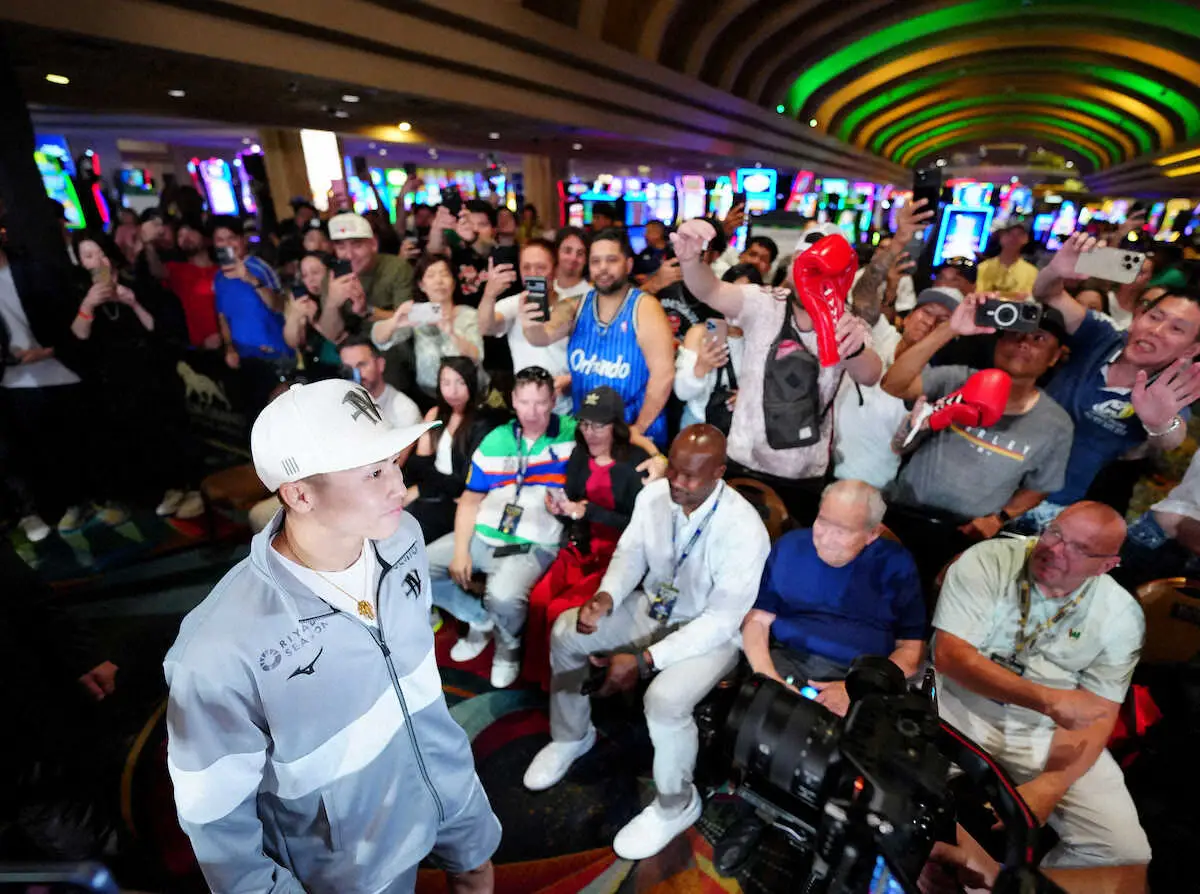 “ボクシングの聖地”MGMグランドのカジノフロア。白いキャップをかぶり、グレーのウエアに身を包んだ井上が、試合入場曲の「Departure」とともに登場すると、300人以上が詰めかけた会場から拍手と大歓声が起きた。特設リングに上がり、四方に手を振って声援に応え「4年ぶりに戻ってこられてワクワクしている。ここラスベガスで何を求められているか十分承知の上で来ているので、期待通りのボクシングを見せたい」と予告。ベガス過去2戦はコロナ下で開催されたが、約1万5000人の来場が見込まれる今回は、本場のファンを魅了するド派手なKO勝利を誓った。