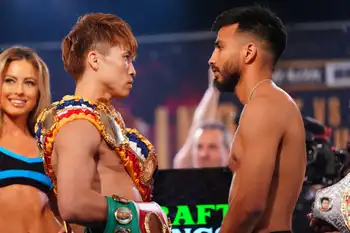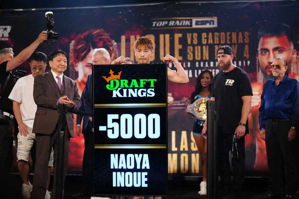 <井上尚弥 前日計量>前日計量を終え、カルデナスとフェースオフする井上(撮影・木村 揚輔)