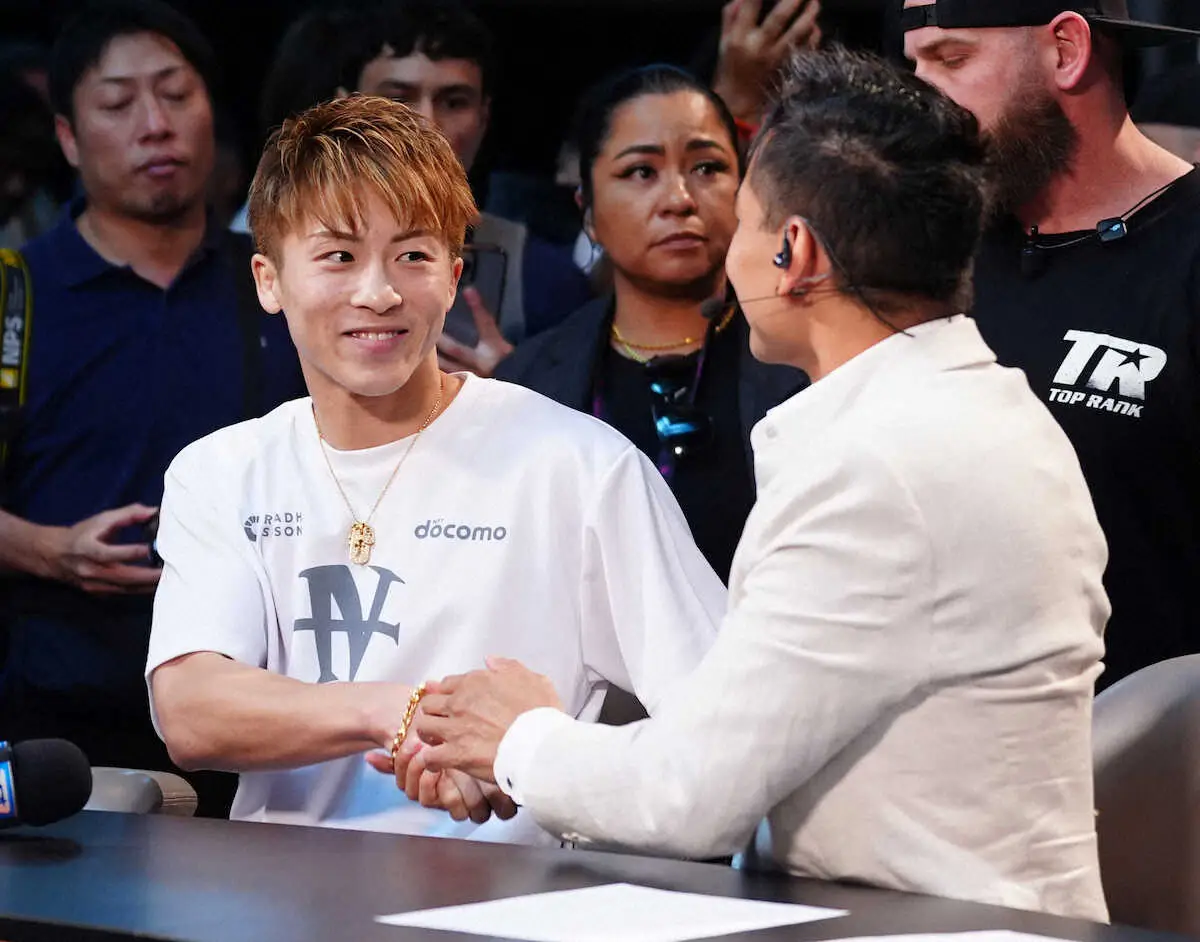 <井上尚弥 前日計量>計量を終え、インタビュアーのドネアと握手する井上(撮影・木村 揚輔)