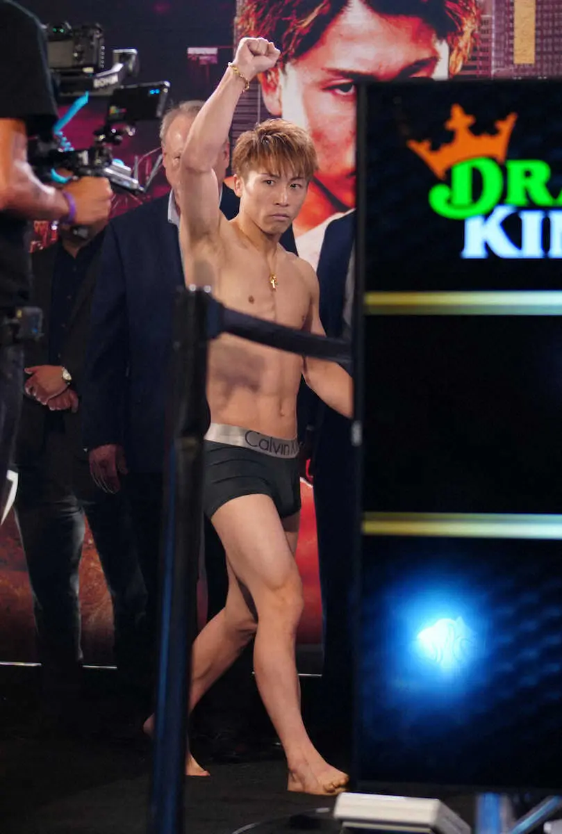 <井上尚弥 前日計量>ガッツポーズで登場する井上(撮影・木村 揚輔)