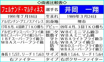 フェースオフではマルティネスと約15秒にらみ合った。サングラス姿の王者は体を揺らし、井岡をなめるように見回すと「1回からパンチの応酬になる。血が湧くような試合をして後半KOを狙う」と挑発。井岡も負けじと「理想はKO。明確に決着をつける」と強気に言い放った。
