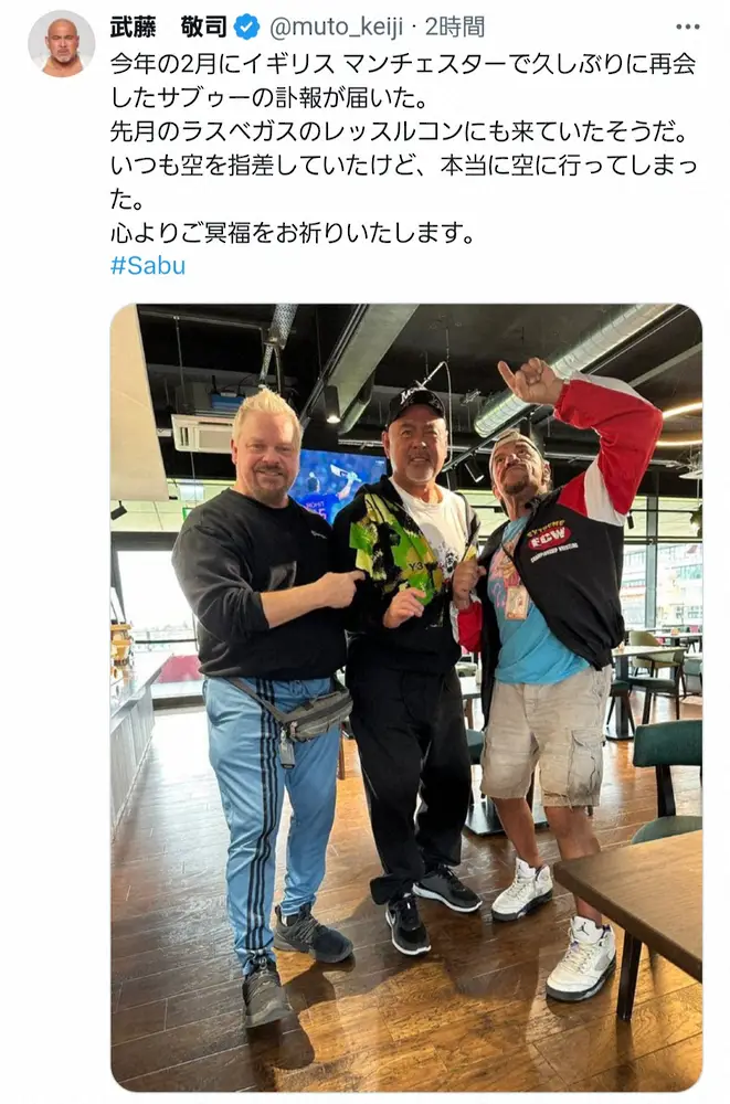 武藤はサブゥーさん、米プロレスラーのシェーン・ダグラスと3人で肩を並べる写真を載せ、「今年の2月にイギリス マンチェスターで久しぶりに再会したサブゥーの訃報が届いた」と投稿。