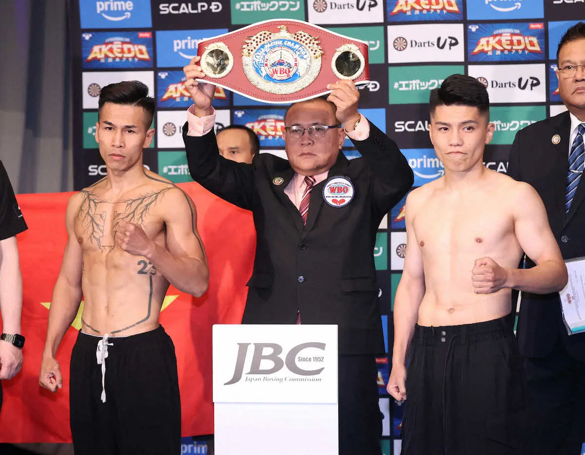 <ボクシング 計量>ポーズを決めるバン・タオ・トランと坪井(右)(撮影・西海健太郎)