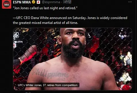 ジョーンズは自身のXに「本日、UFCからの引退を正式に発表します。これは熟考を重ねた上での決断であり、この数年間の道のりに心から感謝の意を表したいと思います」と投稿。今後については「人生のこの章を終えるにあたり、新たな機会と挑戦を楽しみにしています。MMAはこれからも私の一部であり、このスポーツにどのように貢献し、新しい方法で人々に刺激を与え続けられるか、今からワクワクしています」と記した。
