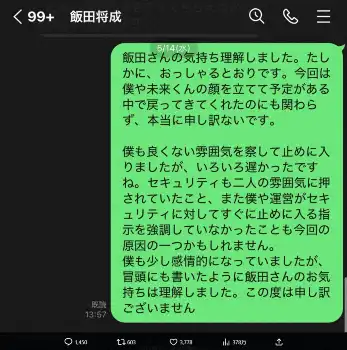さらに「もちろん、おれの謝罪の文章に至らなさはあったかもしれない。それでも、おれなりに彼の気持ちを想像して文章を作って謝罪をした。本当は彼のようにLINEを晒すような女々しい真似はしたくないけど、こちらも少しでも事実を理解してもらえるように添付しておく」と謝罪のLINEのスクリーンショットを公開した。