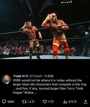 ホーガンさんとともにポーズを取るトリプルH(左)。トリプルH氏の公式Xから(@TripleH) WWEのトリプルH氏「彼こそが“スーパースター”の原型」 ハルク・ホーガン… ギャラリーで見る この記事のフォト 2025年07月25日の画像一覧 もっと見る 2025年07月25日の画像をもっと見る