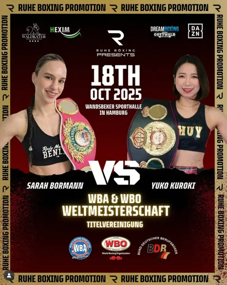 ボルマンはアマチュアのドイツ代表などで活躍後、17年にプロ転向。マイナー団体の王座やWBC、IBFミニマム級の暫定王座を経て、昨年12月に自身初のメジャー団体正規王座となるWBO女子ミニマム級王者となった。1メートル63のオーソドックスで、愛称は「ベビーフェース」。23年12月、WBC女子世界ライトフライ級王座に挑んでの判定負けがプロ唯一の黒星となっている。