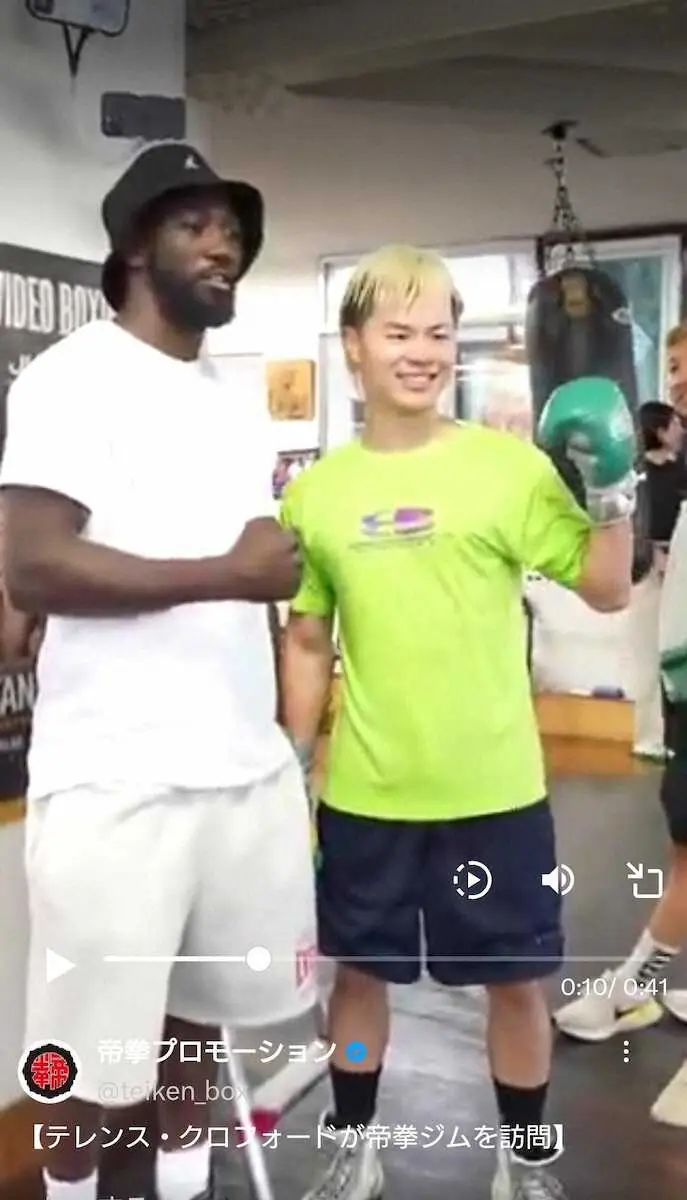公式Xでは、黒のバケットハット、白の短パンとTシャツとくつろいだ姿のクロフォードが、帝拳ジム内で那須川らと記念撮影する姿が公開されている。帝拳ジムでは、2016年に、当時WBA世界ウエルター級王者だったキース・サーマン(米国)が突然、現れて関係者を驚かせたことがある。