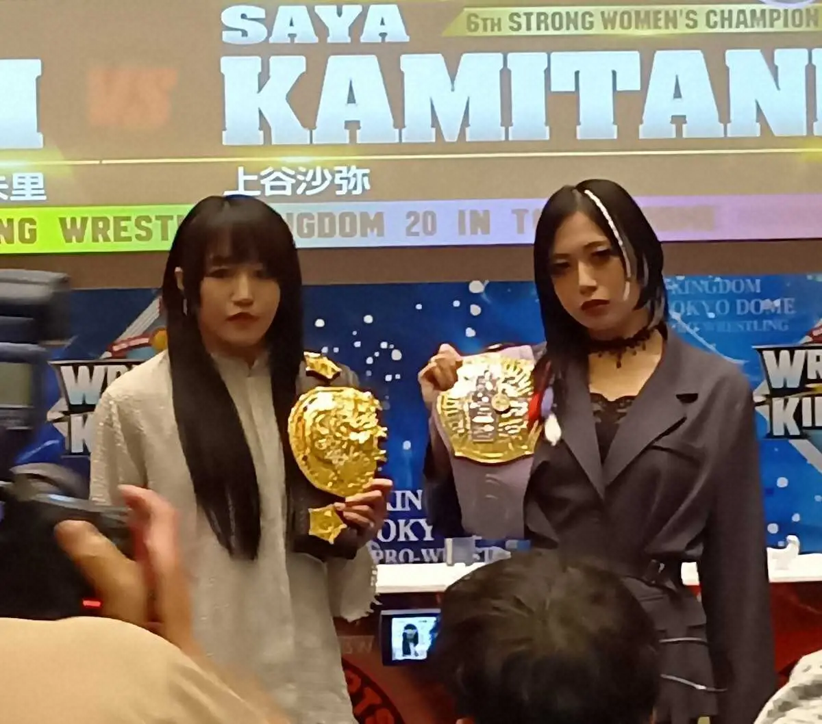 女子プロレスのスターダムのSTRONG女子王者の上谷沙弥とIWGP女子王者の朱里のダブルタイトル戦を発表。会見に出席した上谷は「女子プロレスの強さを象徴する赤いベルトもドームに連れていきたい気持ちもあったけど、そのIWGPのベルトとこのSTRONGのベルト、朱里となら女子プロレスを象徴するような、東京ドームにふさわしい戦いができると思う。でも、朱里が見せる朱世界よりも、沙弥様が見せる悪夢の方が断然面白いでしょ」と自信満々。さらに「新日本プロレスに下克上だ。東京ドームに集まる何万人もの客を沙弥様のとるりこにして、全員奪ってやるよ。新日本プロレス、覚悟しとけよ」と宣戦布告。