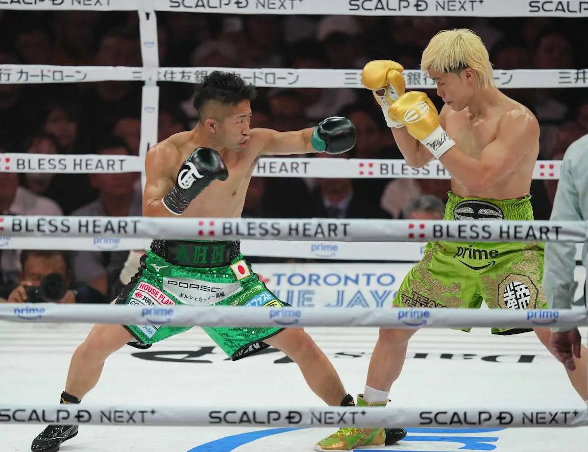 <WBC世界バンタム級王座決定戦 那須川天心・井上拓真>打ち合う井上と那須川(撮影・沢田 明徳)