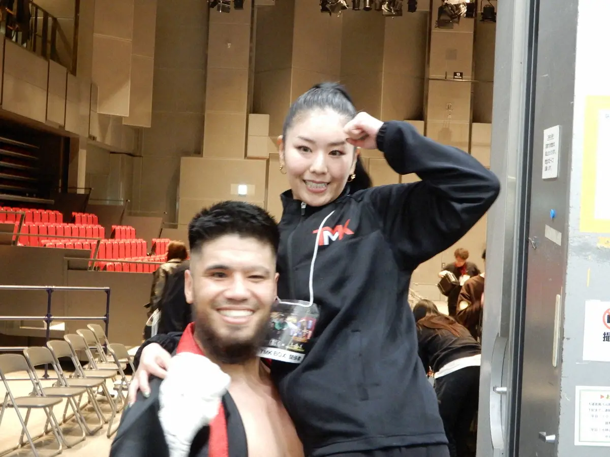 TKO勝利を収め、フィアンセの千本瑞規さんを抱きかかえる但馬ブラントンミツロ