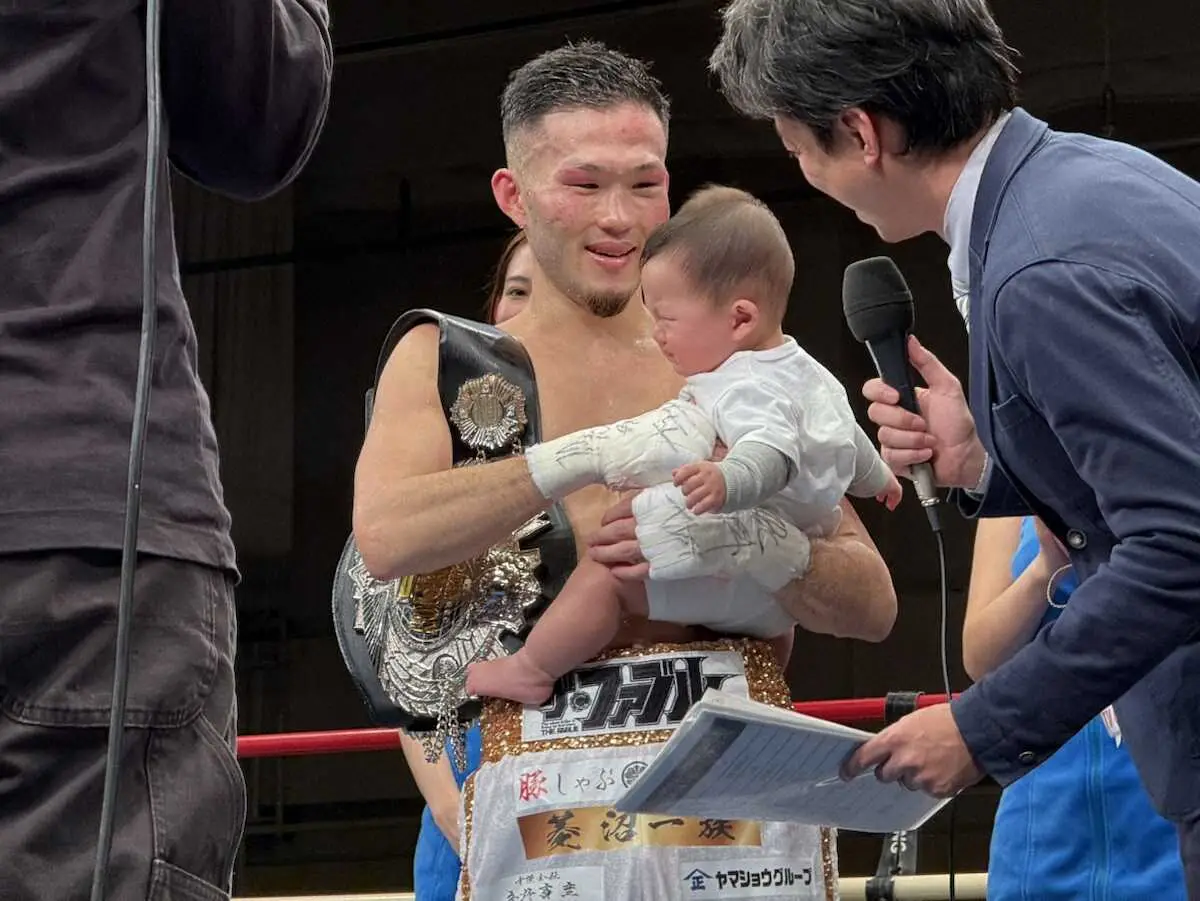 愛息との約束を果たした。昨年6月に第1子の長男・拳生(けんしょう)くんが誕生。「子どものためにも勝たないといけない。勝ってリングに上げたい」と試合前には父として決意を示していた中、快勝した試合後はリング中央で愛息を抱き上げ有言実行。入場時は「拳生」と名を刻んだガウンでリングイン。「内容はよくなかったが、いい試合ができてよかった」父としての使命を果たした。