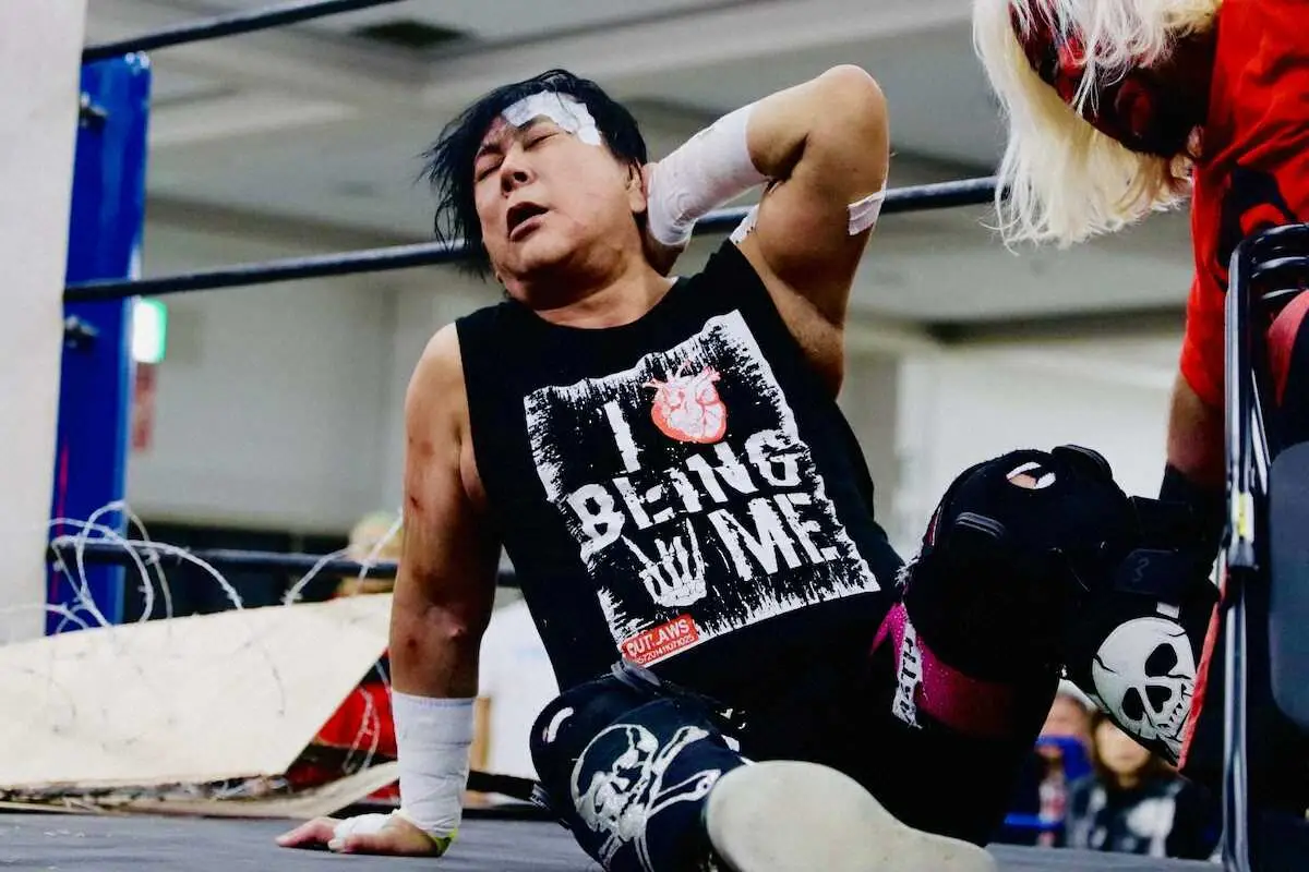 18日に開催された「広島プロレスフェスティバル」のメインで、邪道・大仁田厚は得意技のテーブルでの脳天くい打ちを失敗し、机から転落し首を痛めリング上で一時動けなくなった。