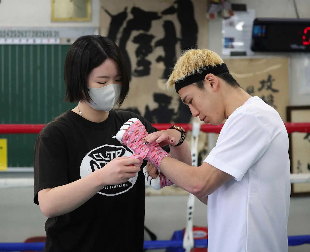 トレーナーの真成美夫人にバンテージを巻いてもらう飯村(撮影・吉田 剛)