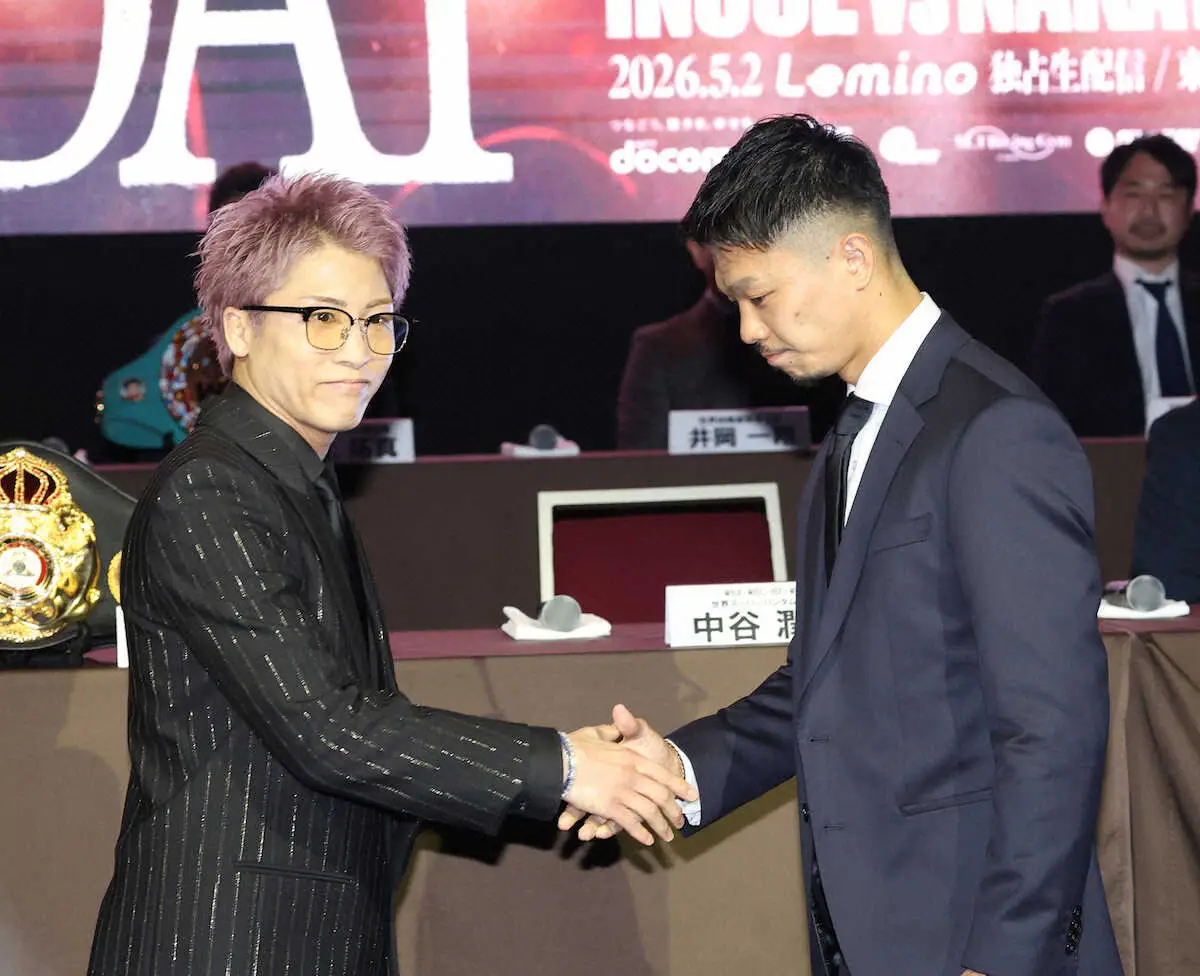 会見に臨む井上尚弥(左)と中谷(撮影・西海健太郎) Photo by スポニチ 井上尚弥「守る気持ちはない。中谷潤人を倒すために全力でぶつかる。格の… ギャラリーで見る この記事のフォト 2026年03月06日の画像一覧 もっと見る 2026年03月06日の画像をもっと見る