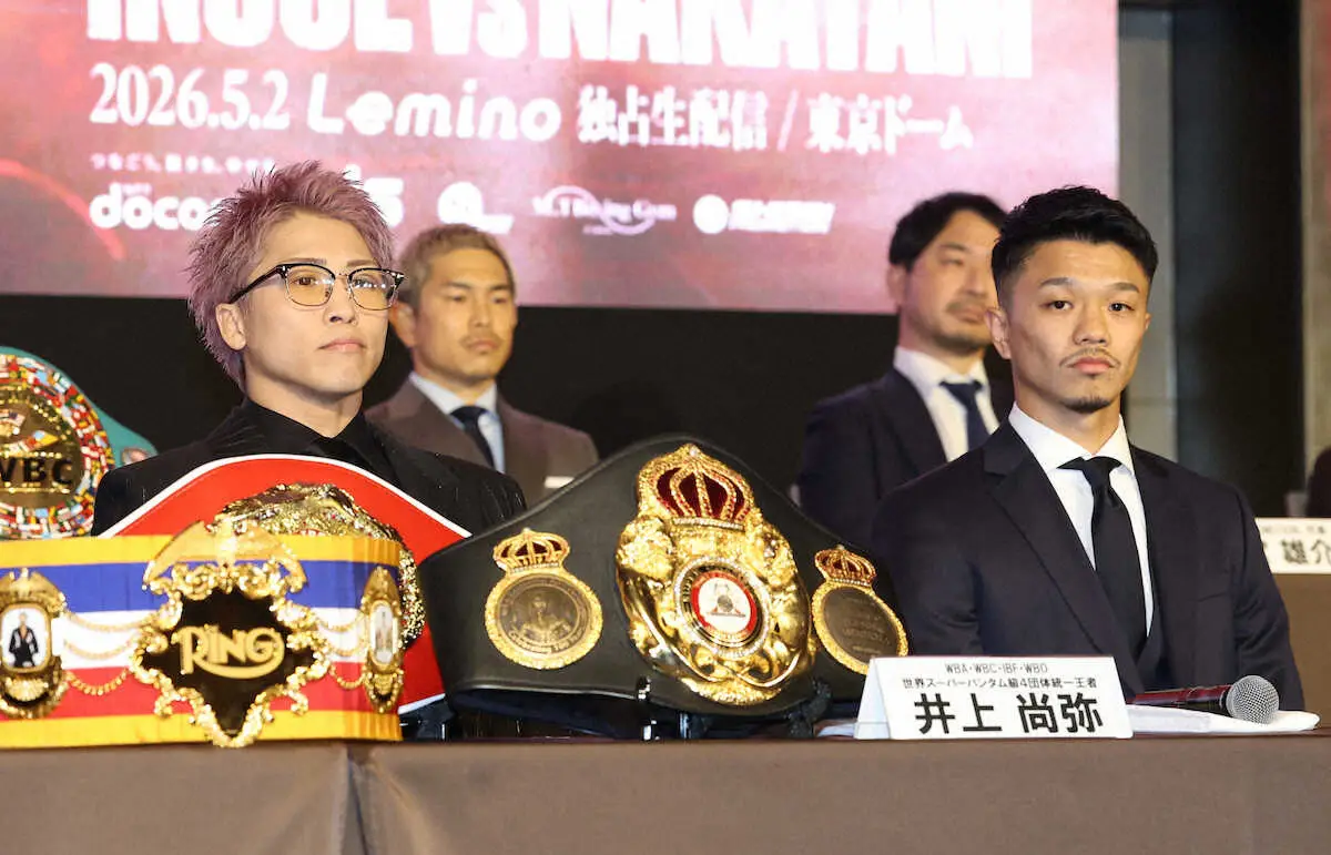 ボクシングの大橋ジムは6日、世界スーパーバンタム級4団体統一王者の井上尚弥(32=大橋、32戦全勝27KO)とWBA・WBC・WBO同級1位の中谷潤人(28=M.T、32戦全勝24KO)が5月2日に東京ドームで対戦すると正式発表した。また、同興行のWBC世界バンタム級タイトルマッチで同級王者の井上拓真(30=大橋、21勝5KO2敗)と同級4位の井岡一翔(36=志成、32勝17KO4敗1分け)が対戦することも発表された。