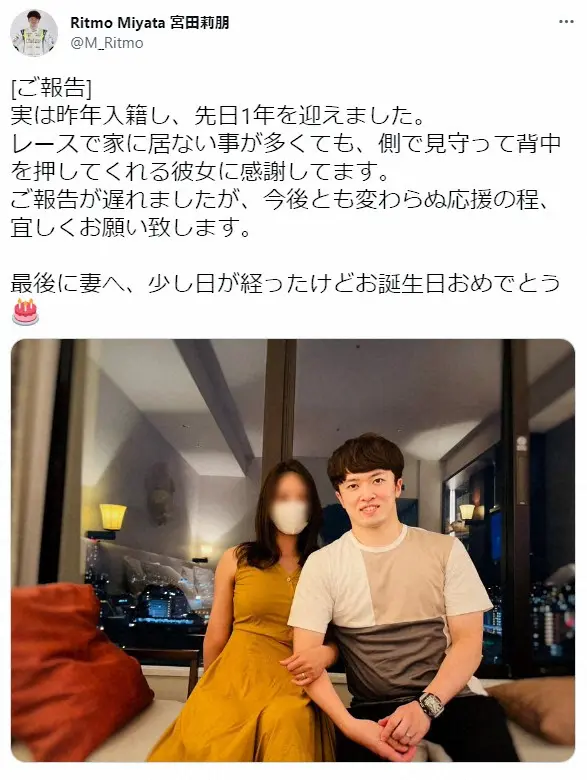 宮田は「実は昨年入籍し、先日1年を迎えました」と2ショットを投稿。「レースで家に居ない事が多くても、側で見守って背中を押してくれる彼女に感謝してます。ご報告が遅れましたが、今後とも変わらぬ応援の程、宜しくお願い致します」と報告し「最後に妻へ、少し日が経ったけどお誕生日おめでとう」とつづった。