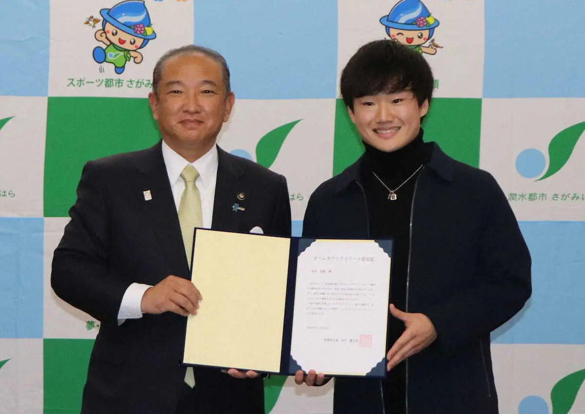 相模原市ホームタウンアスリートに認定された角田裕毅(右)。左は同市の本村賢太郎市長