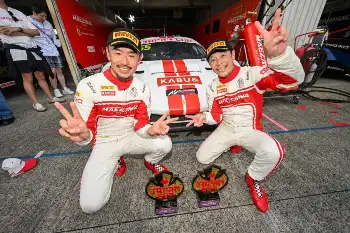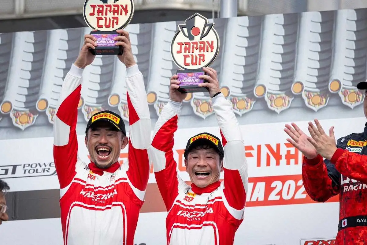 レーシングドライバーの横溝直輝(44)とタッグを組み、「フェラーリ 488 GT3 EVO」で参戦。6月末のレースに続いて表彰台に輝いた。表彰台では横溝とともに盾を掲げて満面の笑みを浮かべた。