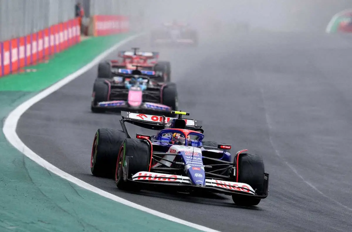 大雨の影響で荒れた予選に続き、決勝もスタート前から波乱が続いた。予選でマシンが大破したウィリアムズのアレクサンダー・アルボン(タイ)が出走を断念。フォーメーションラップでアストンマーチンのランス・ストロール(カナダ)がスピンして動けなくなり、棄権した。仕切り直しのスタートではメルセデスのジョージ・ラッセル(英国)がポールポジション(PP)から出たマクラーレンのランド・ノリス(英国)をかわし、角田はオコン、同僚のリアム・ローソン(ニュージーランド)に挟まれながらも、落ち着いたコース取りで3番手をキープした。