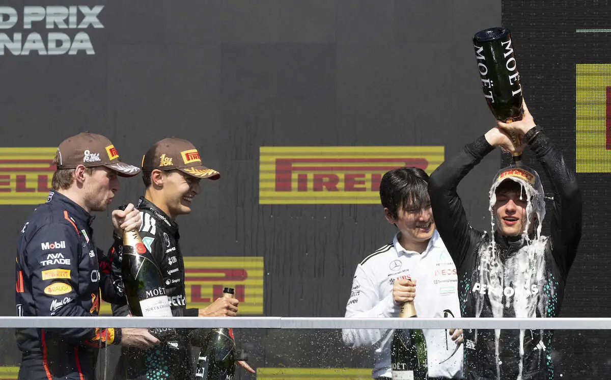 初めて3位に入ったメルセデスのアントネッリが表彰台に自らシャンパンを浴びる。左はエンジニアの桑原克英氏(AP) Photo by AP 写真特集のトップに戻る ギャラリーで見る F1写真特集の画像一覧 もっと見る F1写真特集の画像をもっと見る