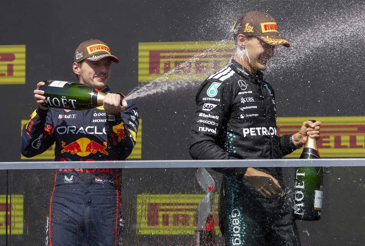 今季初優勝を飾ったメルセデスのラッセル(右)にレッドブルのフェルスタッペンがシャンパンを浴びせる(AP)