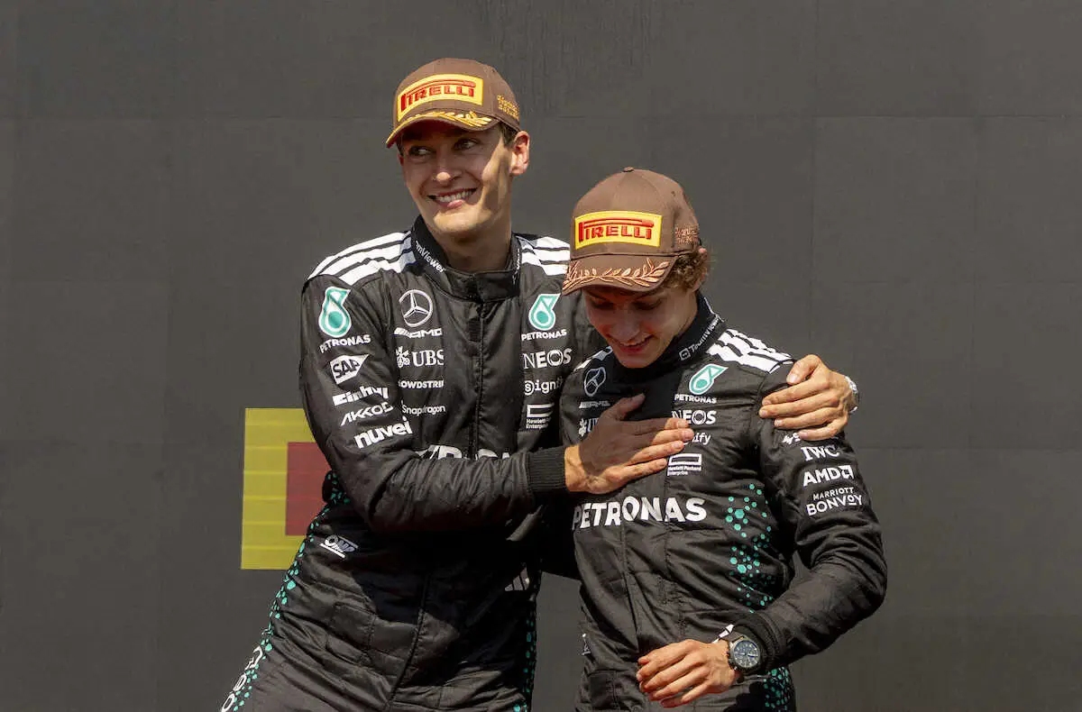 優勝したメルセデスのラッセル(左)と3位のアントネッリ(AP)