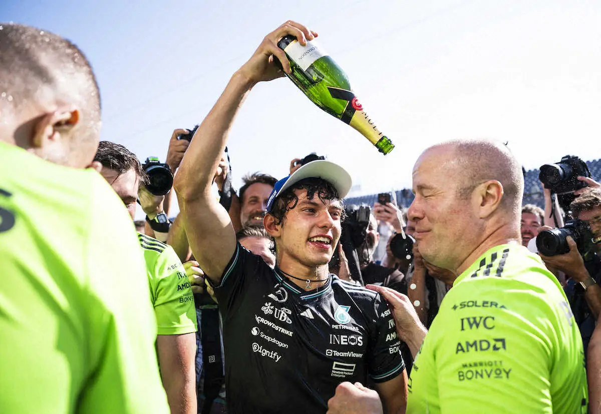 初めて表彰台に立ったメルセデスのアントネッリはスタッフにシャンパンをかけて喜び合う(AP)