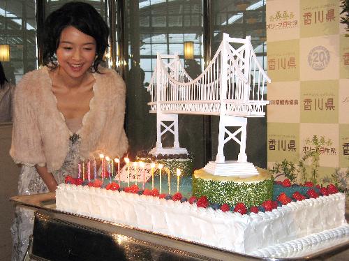 香川県出身の女優・藤澤恵麻(25)が県をPRする「香川かがやき大使」に任命され23日、都内で委嘱式が行われた。「海があり山があり木があり、自然が多いのが魅力。魚の新鮮さもびっくりするほどです」と笑顔でアピールし、大使としての仕事をスタート。「私自身も香川の魅力を再発見したい」と話した。今年は瀬戸大橋開通20周年で、橋をイメージした巨大ケーキも登場した。