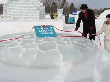 北海道七飯町の大沼国定公園で、大ヒット曲「千の風になって」をイメージした氷のモニュメントが完成し、大沼観光協会が1日午後、除幕式を開き、報道関係者らにお披露目した。曲を手掛けた作家新井満さんも招待され、出席した。
