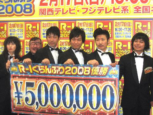 「R―1ぐらんぷり2008」の決勝進出者発表会見に出席した(左から)鳥居みゆき、芋洗坂係長、あべこうじ、COWCOW山田よし、世界のナベアツ、中山功太