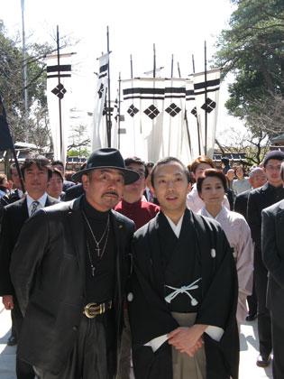 武田神社でキャンペーンの“お練り”を行う主演の市川亀治郎(前列右)とJJサニー千葉(前列左)
