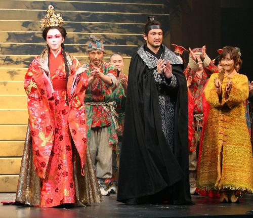TBS(東京都港区)横に27日、新劇場「赤坂ACTシアター」がオープンし、こけら落としの舞台「トゥーランドット」が開幕した。プッチーニのオペラを原作に、宮本亜門氏(50)が演出。メーンキャストの将軍を演じた歌舞伎俳優の中村獅童(35)は、25日発売の写真誌で女優の鈴木砂羽(35)との焼き肉デートを報じられてから初めて公の場に登場。冷酷な将軍をふてぶてしい表情で演じ、歌も披露した。敵役の岸谷五朗(43)とは激しい立ち回りも見せ「この将軍で僕の後半生の運命が定まることでしょう。どうか厳しく見届けてください」とコメント。先月29日には女優の竹内結子(27)との離婚が成立し、今作を“ニュー獅童”の第1歩にしたいようだ。共演は安倍なつみ(26)、早乙女太一(16)ら。4月27日まで。
